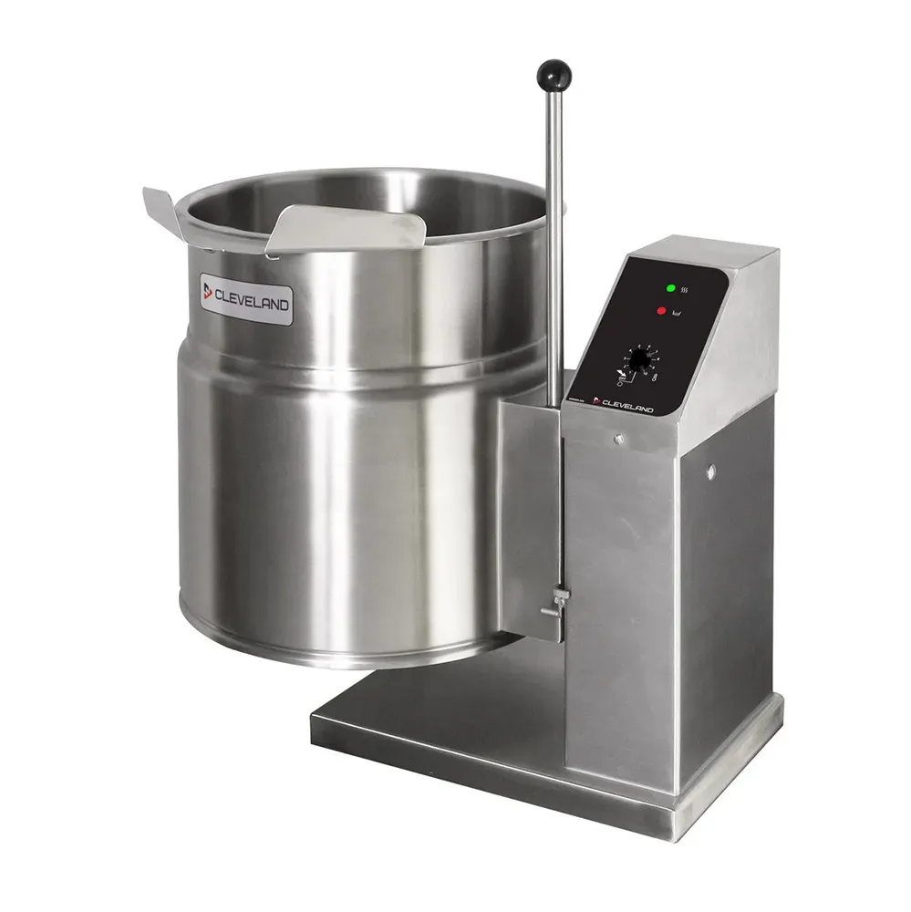 Set new standards in food service with the Cleveland KET3T Electric Countertop Kettle. Designed for commercial restaurant use, this 3-gallon (11L) capacity kettle is perfect for preparing large quantities of soups, stews, and sauces. Its 2/3 steam jacket design ensures even heat distribution, while the lever style tilting feature allows for easy pouring and serving. The anti-drip pour spout prevents messy spills, and the IPX6 water protection controls ensure safe operation. With a self-locking marine style safety latch and reinforced rolled rim, this kettle is built to withstand the demands of a busy kitchen. The stainless steel construction with a 316 series stainless steel liner guarantees durability and hygiene. Rated at 50 PSI, this kettle delivers exceptional performance and reliability. Elevate your restaurant's efficiency and productivity with the Cleveland KET3T Electric Countertop Kettle.