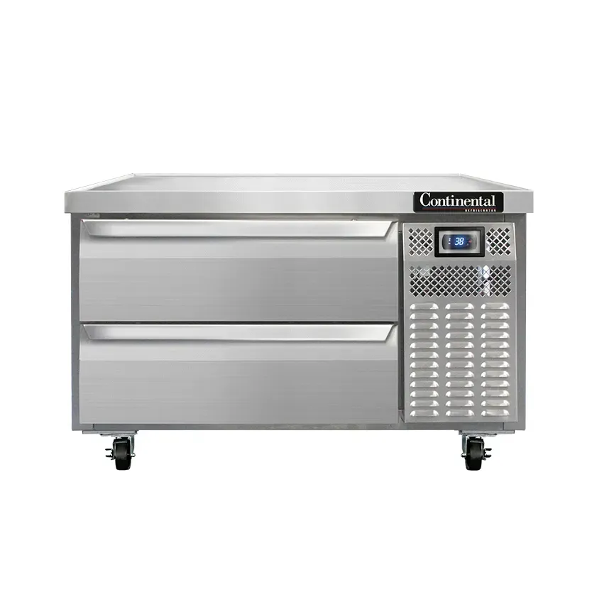 Realize kitchen dreams with the Continental Refrigerator D36GN Equipment Stand. This refrigerated base is a must-have for any commercial restaurant looking to optimize their kitchen space. With its stainless steel exterior and interior, this stand is not only durable but also easy to clean, ensuring a sanitary environment. The stand features two drawers that can accommodate various sizes of pans, allowing for efficient organization and easy access to ingredients. The stainless steel top with a drip guard marine edge prevents spills and messes, keeping your workspace clean and tidy. The electronic control with a digital display allows for precise temperature control, while the hi-low alarm and high/low temperature alarm ensure food safety. Made in the USA and certified by cETLus and NSF, this Continental Refrigerator Equipment Stand is a reliable and high-quality addition to any commercial kitchen.