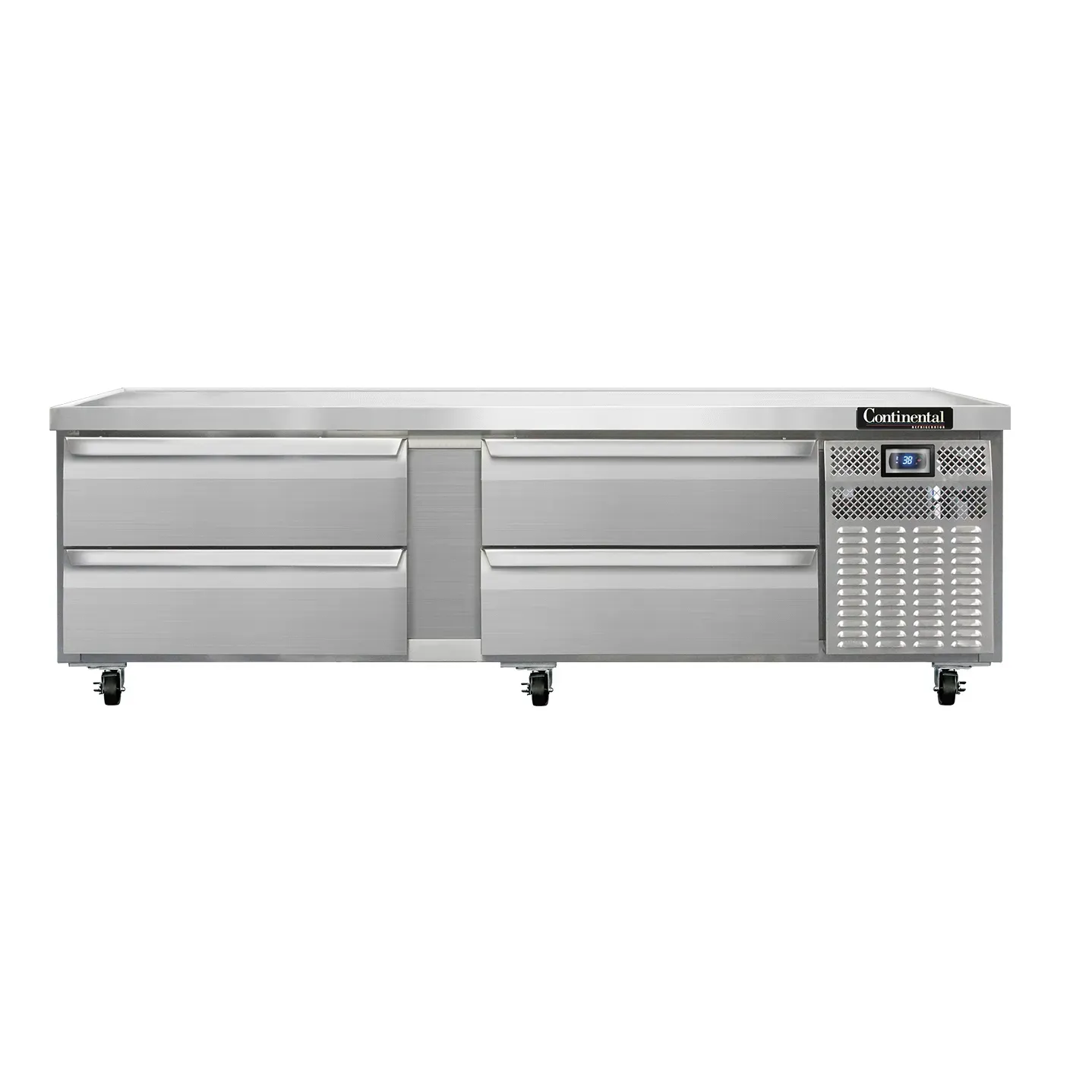 Experience kitchen innovation with the Continental Refrigerator D84GN Equipment Stand. This refrigerated base is designed to meet the demands of a commercial restaurant, offering convenience and efficiency in one package. The stand features four drawers that can accommodate two 12" x 20" x 6" pans, providing ample storage space for ingredients and prepared dishes. The stainless steel top with a drip guard marine edge ensures easy cleaning and prevents spills from reaching the floor. With an electronic control and digital display, you can easily monitor and adjust the temperature to suit your needs. The hi-low alarm and high/low temperature alarm provide added peace of mind, alerting you to any fluctuations in temperature. Made in the USA and certified by cETLus and NSF, this equipment stand is a reliable and durable addition to any commercial kitchen. Upgrade your restaurant's efficiency with the Continental Refrigerator D84GN Equipment Stand.