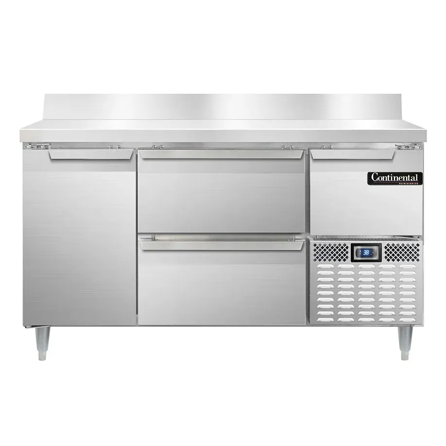 Unleash culinary creativity with the Continental Refrigerator DRA60NSSBS-D Refrigerated Counter Work Top. This designer line unit is perfect for commercial restaurant use, offering a spacious 60" reinforced stainless steel work top with a 5-1/2" high backsplash. The stainless steel exterior, front, sides, and interior ensure durability and easy cleaning, while the two drawers and one full and one half-height field rehingeable doors provide ample storage space for ingredients and supplies. The electronic control with a digital display allows for precise temperature management, and the hi-low alarm ensures food safety. With a 1/3 HP side-mounted refrigeration system, this unit is both efficient and reliable. The adjustable stainless steel legs provide stability, and the unit is cETLus and NSF certified, guaranteeing its quality and safety. Made in the USA by Continental Refrigerator, this refrigerated counter work top is a must-have for any commercial kitchen.
