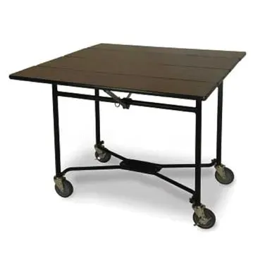 Revamp setup with efficient selection! Introducing the Lakeside Manufacturing, 74413, Room Service Table. This square table is designed to enhance the efficiency of your restaurant's room service operations. With its folding frame and top, it offers compact storage when not in use, saving valuable space in your establishment. The slide bar leaf supports with piano hinges ensure stability and durability, allowing you to confidently serve your guests. The walnut woodgrain laminate top adds a touch of elegance to any setting, while the powder coat black frame provides a sleek and modern look. Equipped with 4" casters, including 2 with brakes, this table is easy to maneuver and secure in place. Made in the USA by Lakeside Manufacturing, this room service table is a reliable and high-quality addition to your commercial restaurant.