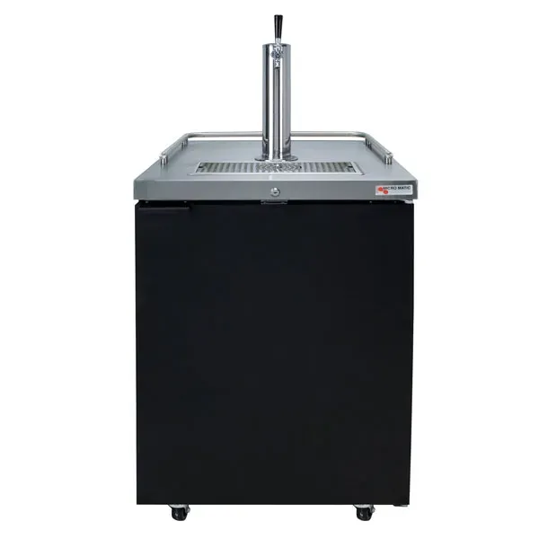 Cook with confidence and flair with the Micro Matic USA, MDD23GR-E Draft Beer Cooler. This Pro-Line E-Series cooler is perfect for commercial restaurant use, offering a one-section design with a spacious 8.4 cu. ft. capacity. It can accommodate one 1/2 size keg, ensuring you always have a refreshing draft beer on tap for your customers. The cooler features an integral glass rinser, allowing you to easily clean your glasses before serving. The 3" diameter polished stainless steel draft tower comes with a faucet (faucet knob not included) for convenient pouring. With a solid hinged door that locks, you can securely store your kegs. The analog dial thermostat ensures precise temperature control, while the automatic condensate evaporator keeps maintenance to a minimum. The galvanized steel interior walls and stainless steel interior floor with keg slide make cleaning a breeze. The stainless steel top with a glass guard rail adds a touch of elegance to your bar area. The black vinyl over steel exterior is both durable and stylish. With casters for easy mobility, this draft beer cooler is a must-have for any commercial restaurant.