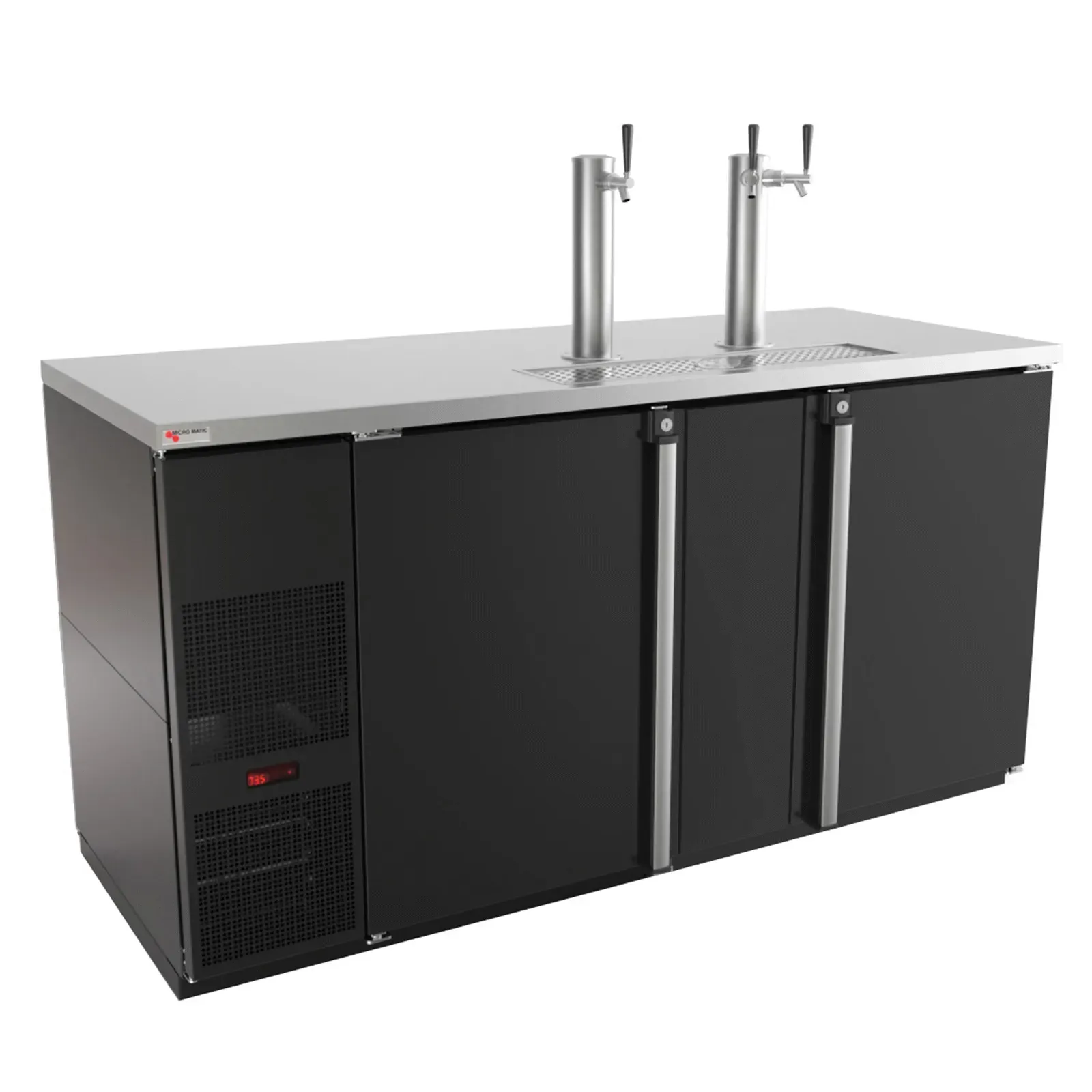 Achieve kitchen supremacy with the Micro Matic USA, MDD68-E Draft Beer Cooler. This Pro-Line E-Series cooler is designed to meet the demands of a commercial restaurant, offering a spacious 28.0 cu. ft. capacity to keep your draft beer perfectly chilled and ready to serve. The self-contained refrigeration system ensures efficient cooling, while the digital thermostat allows for precise temperature control. With two-sections and three solid hinged doors, this cooler provides ample storage space and easy access to your beverages. The integral glass rinser and removable grill make cleaning a breeze, while the automatic condensate evaporator helps maintain a clean and hygienic environment. The polished stainless steel draft towers with three faucets are NSF-approved, ensuring the highest quality standards. With its ENERGY STAR certification, this cooler is not only efficient but also environmentally friendly. Elevate your restaurant's beverage service with the Micro Matic USA, MDD68-E Draft Beer Cooler.